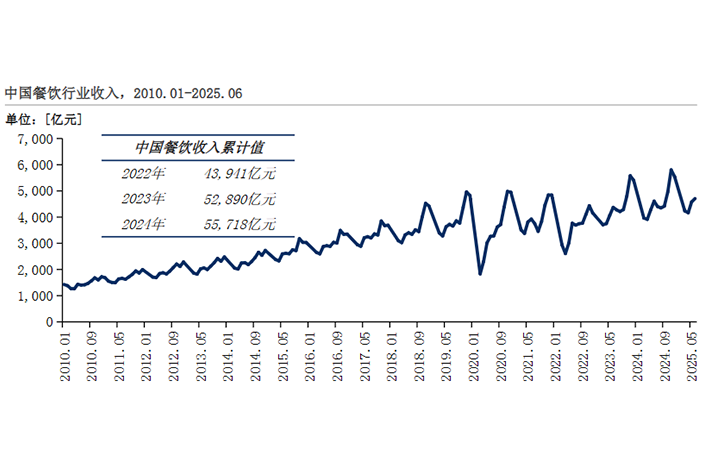 近年来,中国餐饮行业呈现强劲增长态势,收入呈波动上升趋势。2024年,中国餐饮行业总收入达55,718亿元,同比增长5.3%,行业规模持续扩大、市场稳步发展。